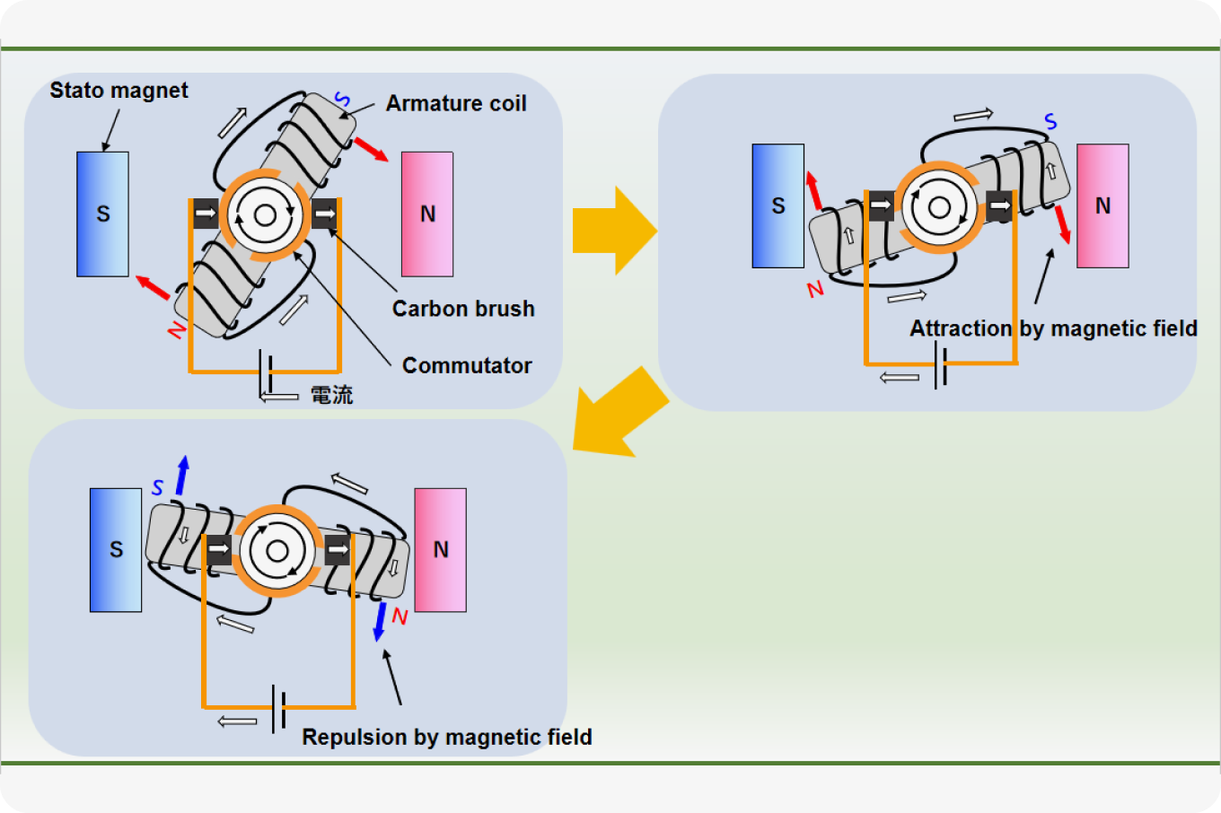 Early electric motors and generators, invented in the mid-19th century, used brushes made of bundled copper wires (copper braided brushes). Subsequent inventions replaced them with blocks made of graphite (carbon). Therefore, the “brush” remains as the name, and it continues to be referred to as a carbon brush.